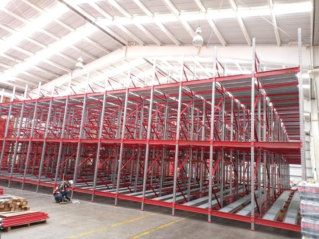 Sistema donde las tarimas se empujan hacia atrás dentro del rack, permitiendo almacenar multiples pallets con un solo acceso.
